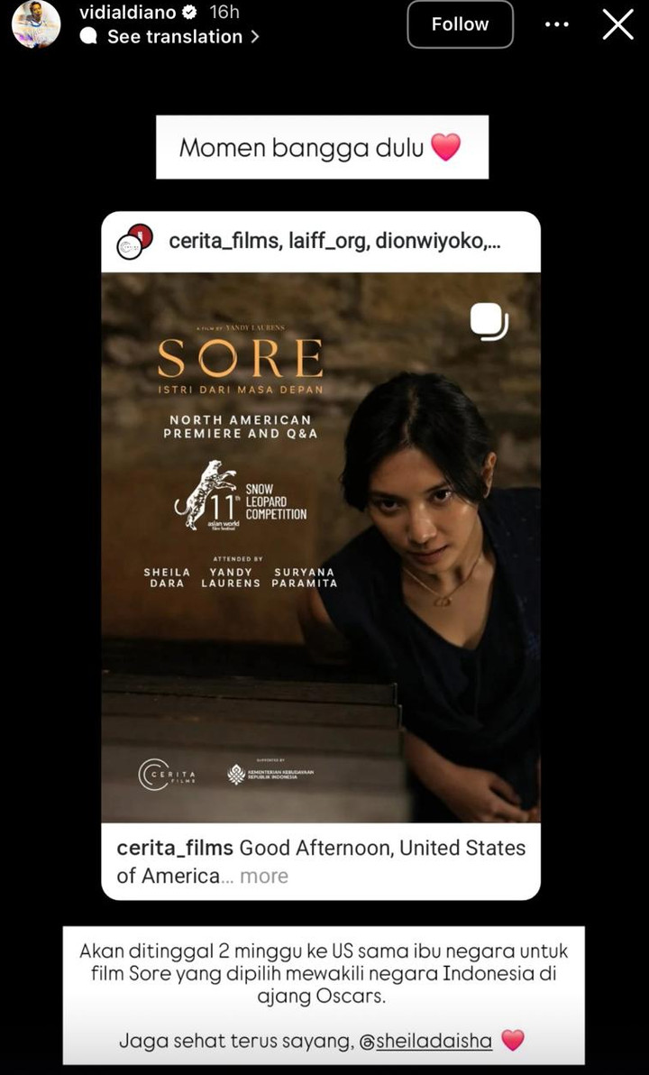 Dalam unggahan Instagram Story-nya, Vidi Aldiano mengungkapkan bahwa istri tercintanya, Sheila Dara, akan bertolak ke Amerika Serikat selama dua minggu. Ia mengungkapkan rasa bangga karena film yang dibintangi oleh sang istri mewakili Indonesia dalam ajang Oscar 2026.